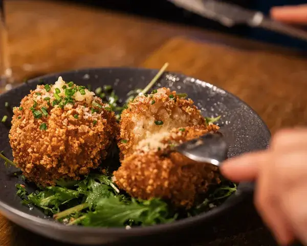 Arancini de risotto à l’artichaut, persil, vin blanc et romarin, avec huile de truffe blanche et stracciatella.