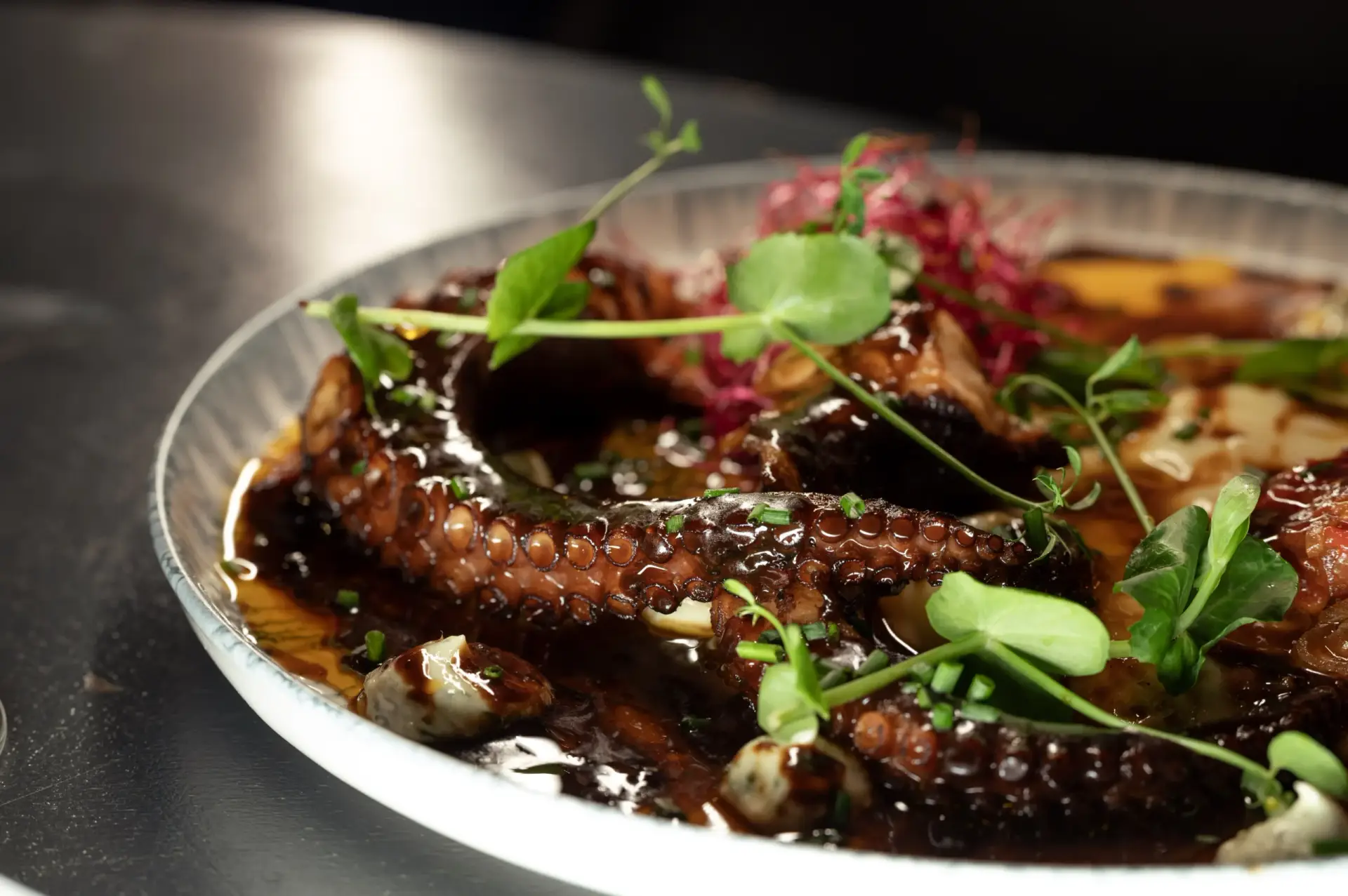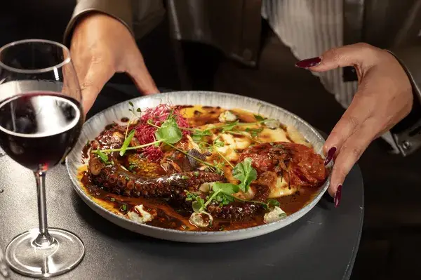 Poulpe basse température puis grillé au beurre, crème de tahini, olives taggiasche citron vert, pita grillé, concombre en saumure, vierge de tomate menthe et aubergine frite au zaatar.